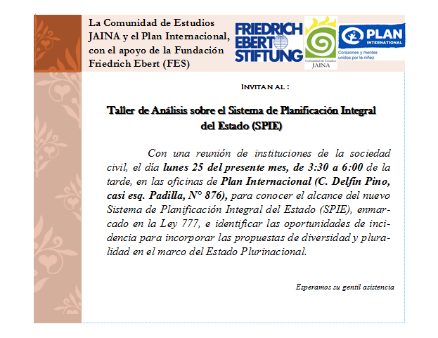 La Comunidad de Estudios JAINA en coordinación con el Plan Internacional y la Central Campesina de Cercado, han convocado el 25 de abril el Taller de Análisis sobre el nuevo Sistema de Planificación Integral del Estado (SPIE) con el objetivo de conocer el alcance de la Ley y determinar las rutas para incidir en los contenidos de los planes.